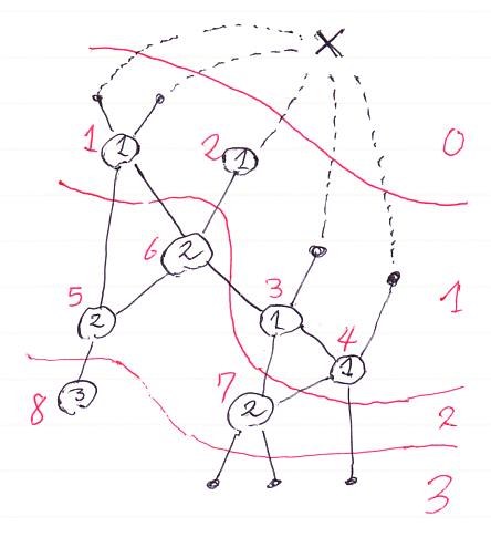 バッテンは仮想ルートノードです。ノード内に世代番号の値が書き込んであります。同じ世代番号のノードを1つの“層”(世代集合)として、赤線で層分けしています。世代0の層は仮想ルートノードだけです。ノードの横に赤で書き込んである番号は全順序による通し番号です。世代番号が小さいノードが先に現れます。