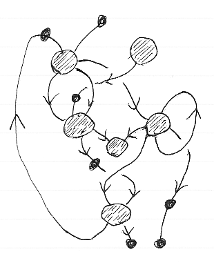 オダンゴがノード頂点、小さな黒丸がワイヤー頂点です。多重辺、自己ループ辺、サイクルを許します。ワイヤー頂点を持たない辺(両端がノード頂点)も許します。この例で辺が交差しているのは、グラフが平面に埋め込めないことがある事を示唆します。平面に埋め込むには交差をノードに変えます。交差を表すノードはブレイド(braiding)や対称(symmetry)に対応するので、ブレイド付きモノイド圏、対称モノイド圏のストリング図が得られます。サイクル(自己ループ辺はサイクルの一種)は、圏のトレースに対応します。