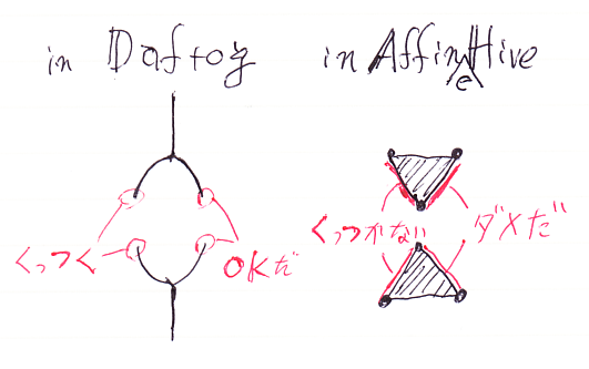ハイブ(三角ハイブ)は、ユークリッド平面内のまっすぐな辺を持つ三角形の集まりとして導入しました。双対グラフで考えたほうが楽なので、ハイブに関する制約を双対グラフの性質として記述しました。その後なしくずしに、ハイブの圏Hiveは、制約付き有向グラフ(ストリング図)の圏Daftogと圏同値であるかのように扱っています。これはマヤカシっぽい話の展開なので、少し補足しておきます。