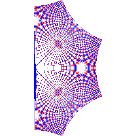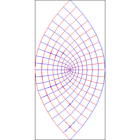 次は平方根関数 w = sqrt(z) の絵で、かなりたくさんの網目を描いています。