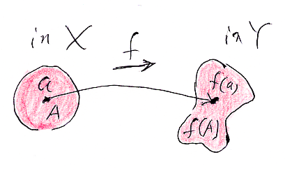 - fがaで連続であるとは、“aの回りの十分に小さな領域”が移った先の領域は、“f(a)の回りのとある小さな領域”からはみ出ないこと。