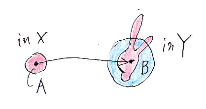 ここでまた、少し発想を変える必要があります。「開球体Aが小さないなら、f(A)も小さい」といった“大小に関わる概念”を捨てて、Y側に特定の範囲(これも開球体)Bを指定したとき、f(A)がB内にスッポリ収まる、という言い回しにします。
