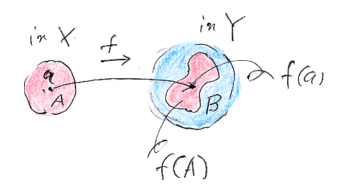 さて、X内の開球体 A∈OBALLSX(a) を取れば、fによるAの像f(A)(f(A)⊆Y)を考えることができます(下の図)。fの連続性は、f(A)が拡がり過ぎない、節度ある範囲に収まることでした。この「拡がり過ぎない」とか「節度ある範囲に収まる」をうまく定式化したいのです。
