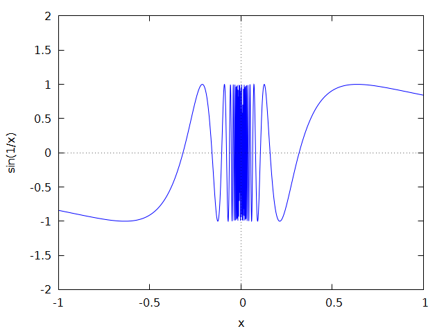 上の関数は、x = 0 の周辺で激しく小刻みに振動します。これも、0の周辺に非常に小さな領域を取っても、y側の範囲は小さくなりません。