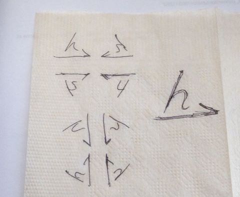 僕は飲食店の紙ナプキンで、絵と文字の変換の練習をします。文字'h'とアローヘッドが半分の矢印を、8種の方向で描いてみます。アローヘッドが半分の矢印とは、ハープーン(もり)と呼ばれる記号で: