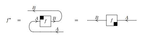 平面内に描かれた絵(ストリング図)を、これらの変換で写すと、別な方式の絵になります。自分が使う方式を決めておいても、皆んながそれを使っているわけではないし、双対や随伴では絵をひっくり返す/裏返すことになります。