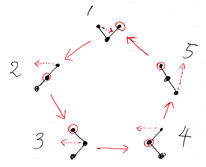 この図の上側の時計回り(青い矢印 1→5→4)の変形をアスキーアートで描いてみます。