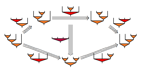 直積はモノイド積なので、交替律〈interchange law〉 FG*F'G' = (F*F')(G*G') があります。交替律を使うと、次のツリーはいずれも同じ関手を表します。グラフとして同じトポロジーなら同じ関手です。