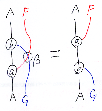 F代数とG余代数の組み合わせ (A, a, b) がFGβ双代数だとは、次の五角形が可換図式となることです。
