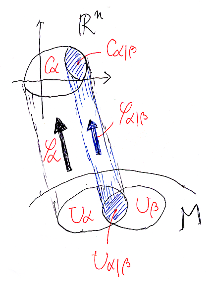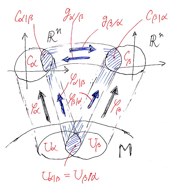 チャート族 {(φi, Ui, Ci) | i∈I} に対して、そのなかの2つのチャート (φα, Uα, Cα), (φβ, Uβ, Cβ) を考えます。次の2つの写像を作れます。
