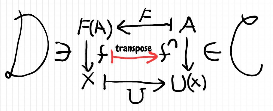 「圏論の随伴をちゃんと抑えよう // 転置と反転置」の復習をしましょう。一般に、F:C → D と U:D → C が随伴関手対(Fが左、Uが右)だとします。このとき、ホムセットのあいだに次の同型(集合のあいだの双射)があるのでした。
