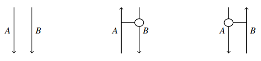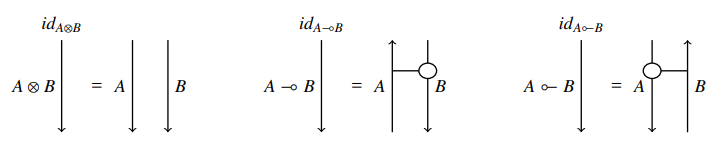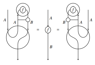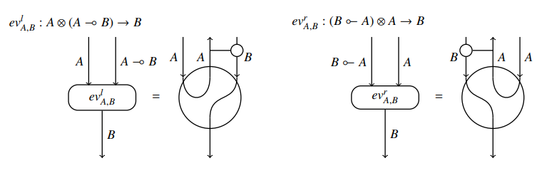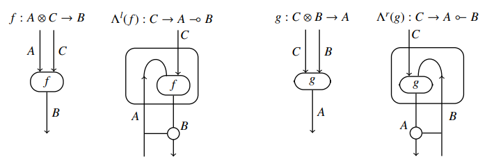 このなかの第7節 "Diagrammatic Reasoning in Monoidal Bi-Closed Categories" で、対称とは限らないモノイド閉圏におけるストリング図の描き方が説明されています。このテの絵はもう珍しくはないのですが、「おおっ」と思ったことがあります。