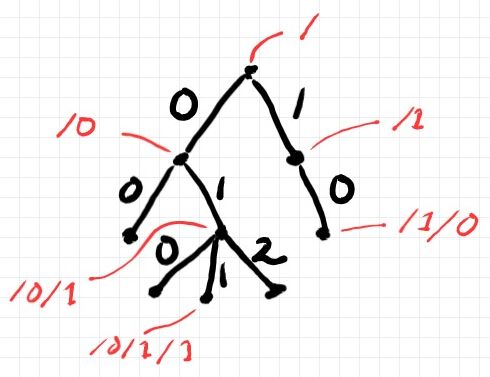 部分集合 LVOTree(A) が何であるか説明します; LVTreeN(A) は、キー(グラフの辺ラベル、パスのセグメント)の集合をNとしたリーフ値付きツリーの集合です。Nを単なる可算無限集合と捉えるのではなく、通常の大小順序で全順序集合と考えます。兄弟ノード達を、0 < 1 < 2 < ... と連番で番号付けます。すると、兄弟のあいだに順序が決まります; 長男ノード、次男ノード、‥‥ という具合に。このような番号付けと兄弟間全順序を持つリーフ値付きツリーの集合が LVOTree(A) です。LVOは、Leaf Velued and Ordered です。下図は兄弟間の順序と、ノードのパス表現(赤字、スラッシュと数字1が紛らわしいかな)を示した図です。