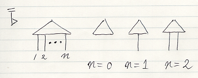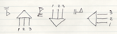 三角形のノードからn本のワイヤーが出た形ですね。上の絵は、描画方向を上から下として描いたものです。左上の“旗”は描画方向を示すものです。他の描画方向で、n = 3 のアレンジメントを描いてみます。