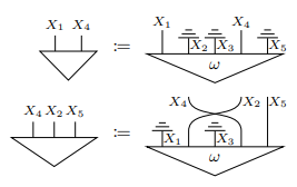 ストリング図/アレンジメント図を、条件化可能マルコフ圏Cにおいて直接解釈〈意味付け〉すると微妙に不便なところがあります*5。Cと密接に関係する簡約多圏〈reduced polycategory〉(「対称モノイド多圏(簡約版)」参照)Pにおいて解釈すると幸せになれます。