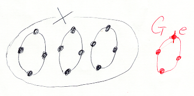 次の図は、Gが4元の群(例えば Z/4Z)で、Xは3つの軌道(各軌道は4元)の直和集合になっている例です。群Gには特別な点である単位元が明確に決まってますが、軌道上に特別な基点はありません*1。