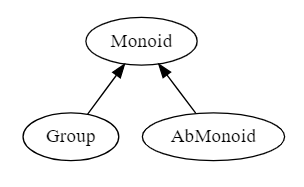 前節の階層構造のグラフは、グラフ理論の意味でのDAG〈Directed Acyclic Graph〉です。サイクルを(もちろん自己ループ辺も)持ちません。有向グラフの2頂点を結ぶ辺が高々1本のとき、グラフは単純〈simple〉といいます。前節のグラフは、CommSemiring → AbMonoid の辺が2本あるので単純ではありません。