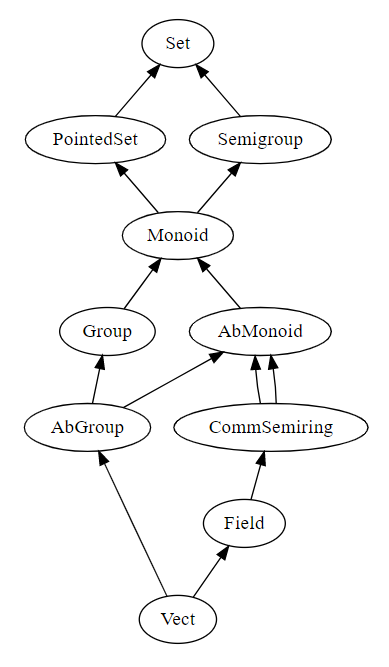 代数構造の種類をもう少し増やした例を出しましょう。階層構造は次の有向グラフで示せます。