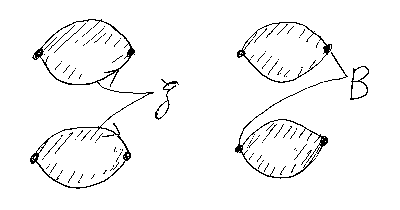 高次圏においても、隣接するk-射は結合できます。しかし、隣接の仕方が多様になります。次の図は、2つの2-射が隣接している様子を隣接境界部分を引き離して描いたものです。図の左側の場合は、1-射 を境界として隣接しています。図の右側の場合は、0-射