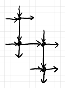 グリッド図は、「左右の方向に双方向通信(または双方向変換)ができて、上下の方向には一方向のデータ処理ができるようなエージェントを表す」と解釈できます。ワイヤー・コーナリング(90度回転)があるので、左右から受け取った通信データを処理データに回したり、その逆に処理したデータを左右に送り出すことができます。