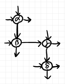 - $`\cat{C}`$ の射 $`f:A \to B`$ に対して、グリッド図のノード $`\mrm{proc}(f) :: \varepsilon \dblto{A}{B} \varepsilon`$ がある。このタイプのノードを処理ノード〈processor node | processing node〉と呼ぶことにします。