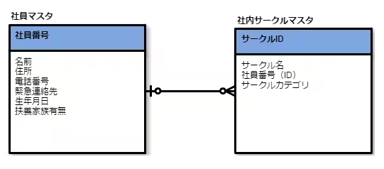 - 「0または1対多の関係」であることを表現しています。上述の「多対多」の例との違いは、[檜山注: 社員とサークルのあいだの所属関係の例で] 社員は0以上の複数サークルに所属できるが、1つのサークルに所属できる社員は0か1名になります。[檜山注: そんなサークルある? 架空の例だからまーいいけど]
