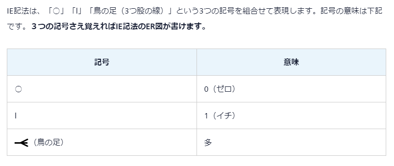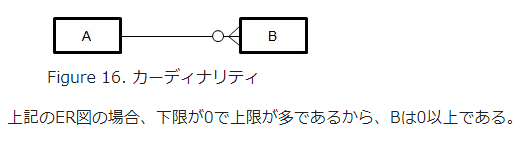 カーディナリティの記号は線の右側だけに付けてもいいようなので(下図、「ER図(Entity Relationship Diagram)」より)、右側のカーディナリティ記号の意味を考えます。