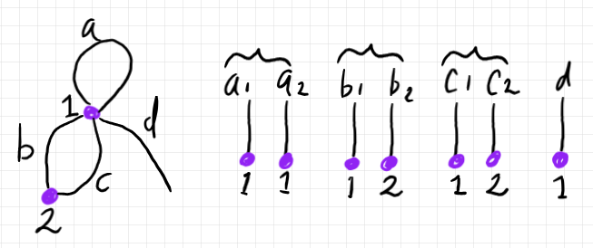 一番目の種類の枝は、カップル $`x, \iota(x)`$ で一本の二頂点辺を表し、ニ番目の種類の枝は、単独で一本の単頂点辺を表すと約束します。