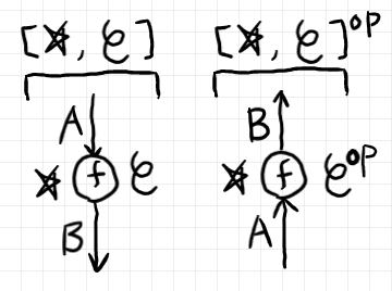- $`\cat{C}^\op`$ の対象としての $`A\in \mrm{Obj}(\cat{C}) = \mrm{Obj}(\cat{C}^\op)`$ は $`A^\uparrow`$ と書く。
