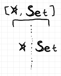 $`[\whitestar, {\bf Set}]`$ とマークされたレーンに描かれるワイヤーは集合とみなされ、ノードは写像とみなされます。特に単元集合 $`{\bf 1}\in |{\bf Set}|`$ は頻繁に使うので、点線ワイヤーで描くと決めておきます。$`{\bf 1}`$ とラベルされていなくても点線なら $`{\bf 1}`$ のことです。