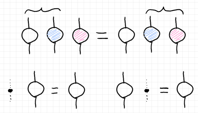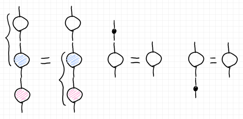 テンソル(射や複射や多射)の結合〈合成 | composition〉は縦方向、上から下に描きます。結合法則〈associative law〉、左単位法則〈left unit law〉、右単位法則〈right unit law〉は以下のとおり。黒丸〈ドット〉は恒等〈identity〉です。