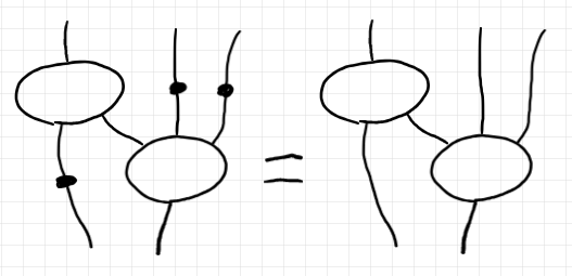ここで言うテンソルは、圏論的に言えば、モノイド圏やトレース付きモノイド圏の射のことです。幾つかのインデックス〈添字〉が付いた配列みたいなモノと思ってもいいです。絵に描くと、脚〈legs〉が出た“テンソルボックス”達をワイヤーで繋いだ図形になります。脚がたくさんあったり、複雑なワイヤリングをすることもあります。
