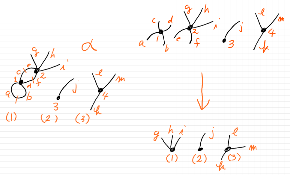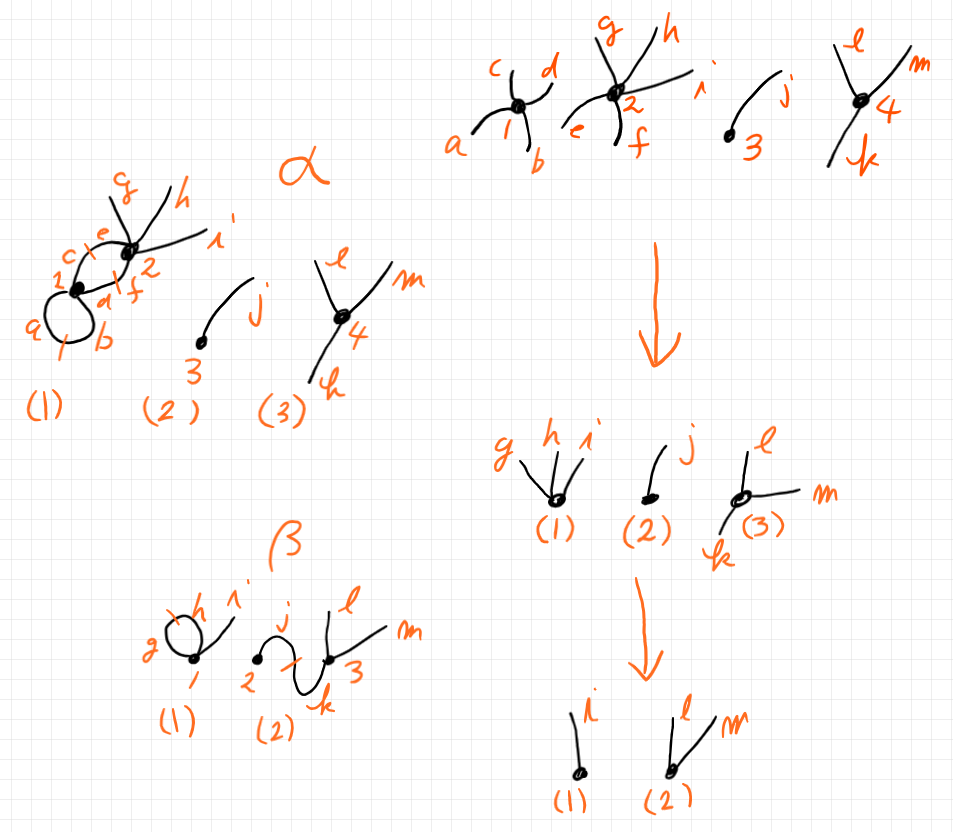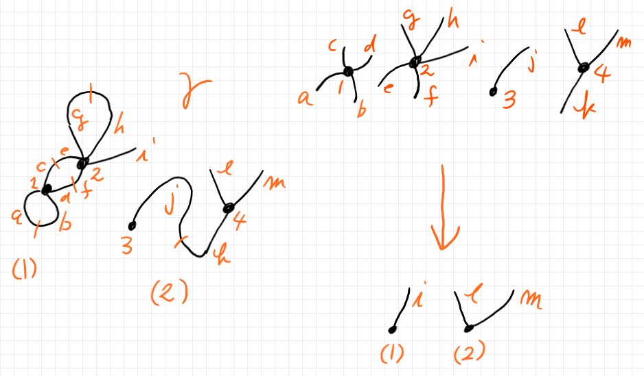 ここで扱う半グラフは、有限の頂点と辺(外部辺または内部辺)を持ち、多重辺(2つの頂点のあいだに複数の辺)も自己ループ辺も認めます。空な半グラフや単一の頂点だけの半グラフもあります。コステロの定義では、無頂点辺と無頂点ループは認めていません。半グラフは連結である必要はありません。どんな半グラフも、幾つかの連結成分に一意的に分解できます。