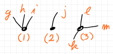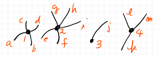 - 半辺はラテン文字小文字でラベルする。ひとつの内部辺は2つの半辺となる。上の例では a, b, ‥‥, m 。