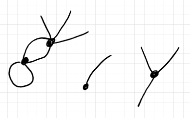 3つの半グラフではなくて、ひとつの半グラフです。3つの連結成分〈connected component〉を持ちます。辺〈無向辺〉は、外部辺〈external edge〉と内部辺〈internal edge〉に分けられます。内部辺は2本の半辺〈half-edge〉が一緒になったものだとみなします。それに対して、外部辺は1本の半辺だけでできています。