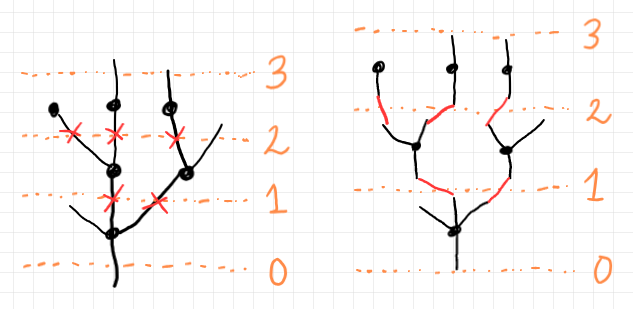 開放ツリーの切り分け分解を、絵を使って大雑把に説明します。以下のように、高さレベルのレベル線を引きます。内部辺がレベル線と交差した位置が切り分ける(辺を切断する)場所です。赤いバッテンが描いてあります。外部辺は切り分けに関係しません。