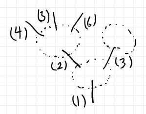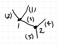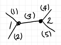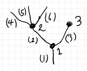 以下は半グラフ〈semi-graph〉の例です。複数の半グラフではなくて1つの半グラフです。頂点〈vertex〉は裸の番号で識別し、辺〈edge〉は括弧付きの番号で識別しています。
