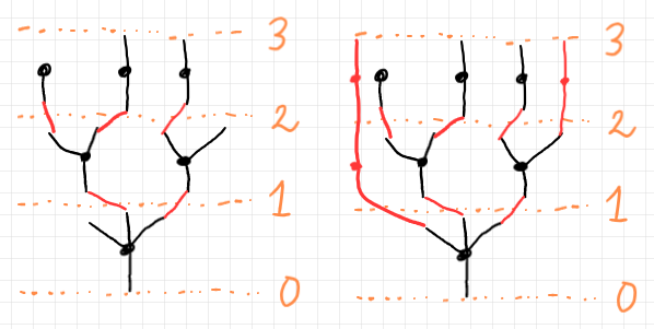 ルート辺の“すぐ上の頂点”があれば、それに高さ 1 を与えます。その他の頂点に関しても、“すぐ下の辺”の高さに 1 を足して頂点の高さとします。“すぐ下の辺”は写像 $`\mrm{under}`$ で一意に決まります。