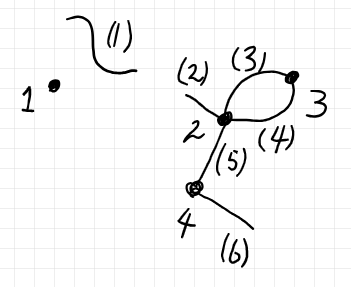 - 辺 (6) は、自己ループ辺です。両端が同一の頂点と接続しています。