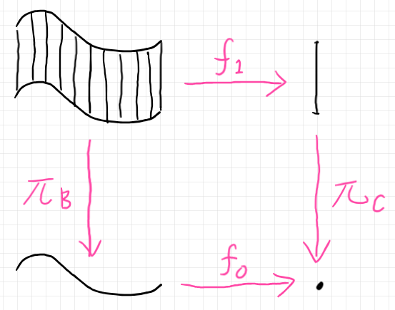 記法を簡略化するために、$`y\in C_0`$ に対して $`X := {f_0}^{-1}(y)`$ と置きます。すると、次の可換図式ができます。