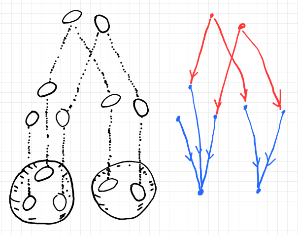 上図は、3つの穴(「ドーナツの穴」ではなくて「靴下の穴」のほう)があいた球面と、2つの穴があいた球面を、境界(の一部)で貼り合わせる方法を指示する図です。左側は少しリアル(下手くそでリアリティあまりないですが)に描いています。右側は貼り合わせ図式の形状グラフです。青い部分が境界図式で、赤い部分が境界図式とアタッチされたマッチング図式です。マッチング図式は、2つのマッチャー・スパンからなり、スパンはどちらも2本脚(つまり非特異マッチャー)です。