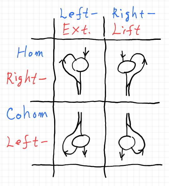$`\quad \mrm{Lan}_T A = \mrm{lcohom}(T, A) = {_T\! A} = \mrm{cohom}_\bullet(T, A)`$ - 右カン持ち上げ = 右ホム対象 = 右指数対象 = 上ホム対象 :
