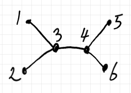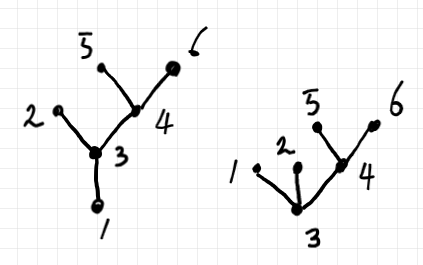 有限無向ツリーのひとつの頂点を“ルート”として選ぶとルート付きツリー〈rooted tree〉になります。頂点 1 をルートに選んだ場合と頂点 3 をルートに選んだ場合の図は以下のようです。