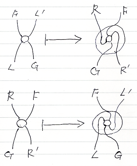 随伴系のあいだの左準同型射/右準同型射の入れ替え2-射は、(ストリング図に描くと)4本脚を持ち、メイト構成可能な2-射です。メイトの構成法に関しては、「随伴系の二重圏 // メイト対応」の絵を再掲しておきます。