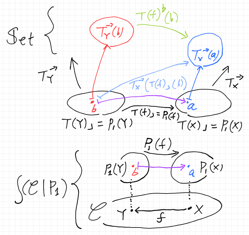 - $`\int(\cat{C} \mid P_1)`$ の射 $`f:(X, a) \to (B, b)`$ は、$`\cat{C}`$ の射 $`f:X \to Y`$ で、$`P_1(f)(b) = a`$ を満たすものである。(反変になっていることに注意。)
