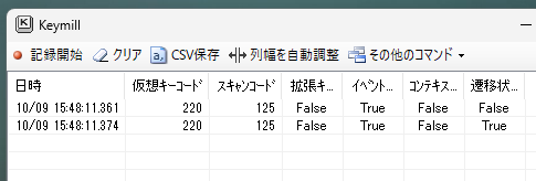上の画像は、バックスラッシュキーを押して、記録停止した状態の画面スナップショットです。スキャンコードが 125 だったので、次のような Autohotkey のテストコードを書いて試してみました。チルダは、キーストロークを消費せずにそのまま素通りさせることを指示します。
