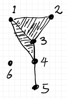 ここから先、単体2-グラフの幾何実現(図形としての表示)をインフォーマルに説明します。引き合いに出す実例は、「ニューラル拡散におけるセルラー層と層ラプラシアン」の六頂点グラフに、辺を2本と三角形〈2-セル〉を2枚追加した図形です。この図形には向き〈orientation〉が付いていません。後で向きについて説明します。